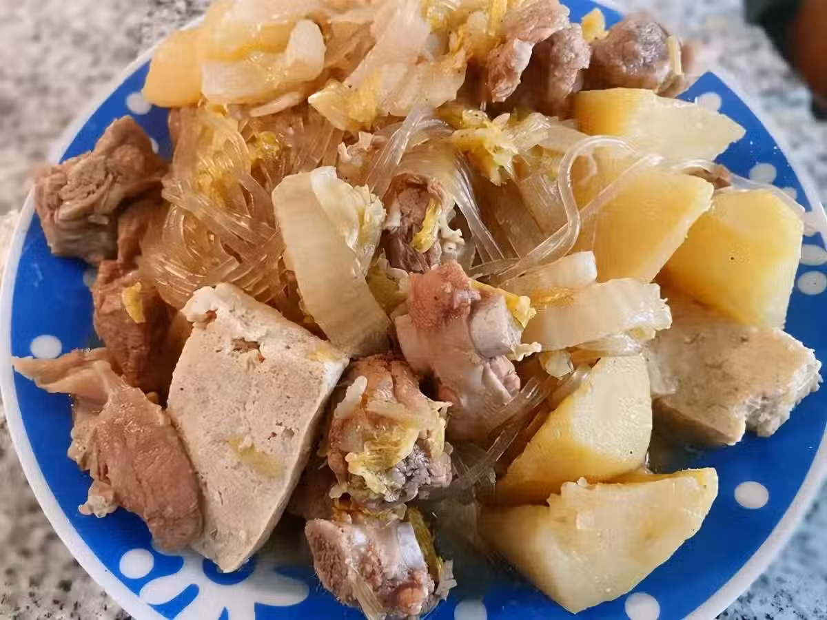 放入粉條燉約2~3分鐘(粉條吸湯,容易發漲,不要放太多),撒點蔥花末(也可以加點雞精提味)。最後將菜和肉從底往上翻,充分拌勻,收湯汁出鍋。