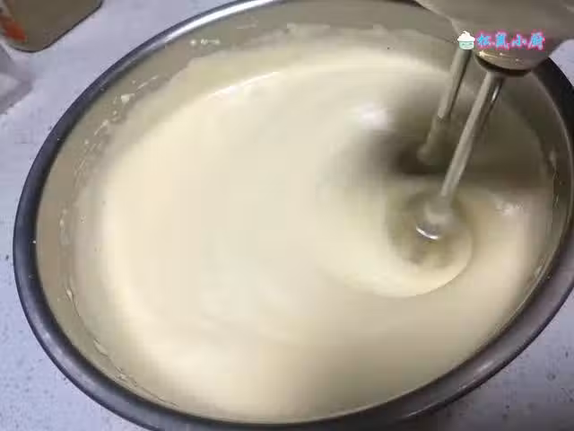 4、全蛋打發時間比較長,所以不要心急。一直要打發到蛋糊看起來非常細膩、濃稠,提起打蛋器,滴落的蛋糊隔十幾秒都不會消失的狀態就好了。就像下圖中的樣子。
