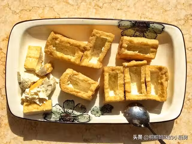 我這次用的是油炸過的豆腐,先用小尖刀在豆腐上劃一個長方形,然後用小湯匙將這個長方形的挖出來,以便稍會放入肉餡。挖出來的豆腐不要扔,等下可以跟豬肉拌成內餡。