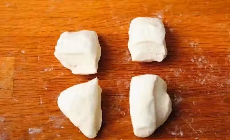 13面團切口朝上,用手壓平,然後將混合好的食材放到面團中間。
