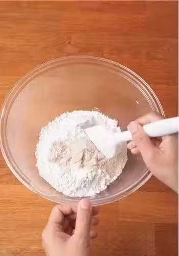 03把步驟1的水類材料倒入步驟2的粉類材料中。(初次使用麵粉時,可以先加入九成水量,其餘水量視情況,用於調整。)