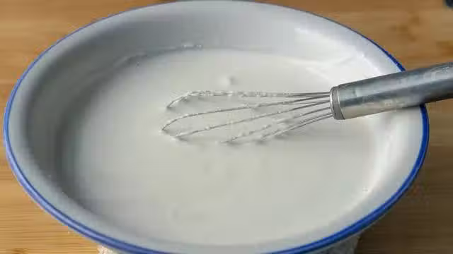 1、先來和面,糯米粉200克,牛奶250毫升,攪拌成沒有顆粒的細膩麵糊。