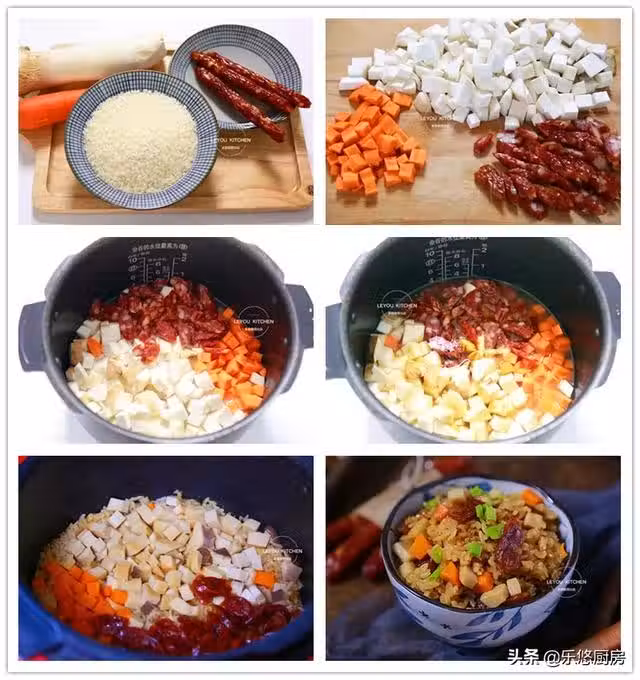 煙熏過的豆乾,有一種特殊的香味,把它和馬鈴薯、米飯搭配在一起。燜好後,吃起來馬鈴薯綿軟,米飯筋道,整個又有香乾的香氣,一點肉沒放,卻比肉還要香。