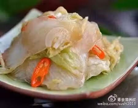 1、白菜去老幫洗凈,用刀片成薄片,白菜幫和白菜葉分開;紅尖椒洗凈,切小段;生薑切成細絲。
