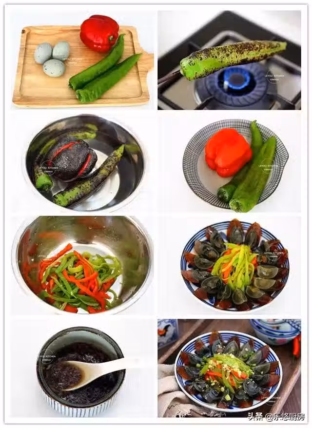 第六步:把皮蛋切成小塊,然後把撕好的辣椒放入中間。如圖。