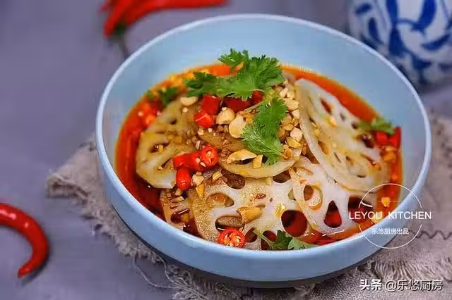 第二步:蓮藕去皮,切成薄片,然後放入涼水中。蒜切末、小紅辣椒切段、香蔥切末、香菜切末備用。