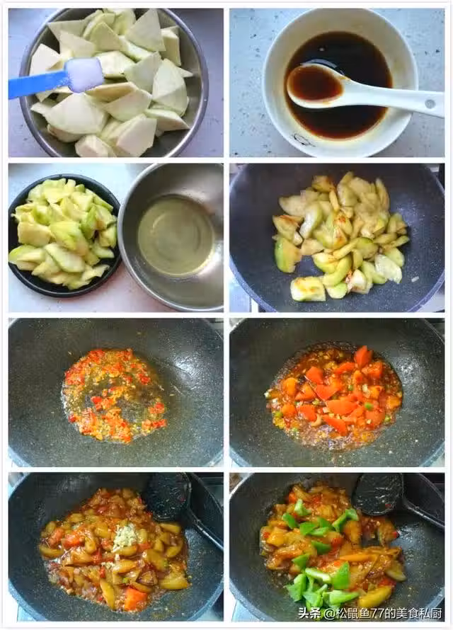 製作:先把圓茄子去皮,切成坡刀塊,加入鹽,攪拌均勻,腌制1小時,中間要不時地攪拌兩次。茄子腌制期間,調一個碗汁,小碗內放入生抽、老抽、蚝油、白糖、雞粉、玉米澱粉,混合攪拌均勻。腌好的茄子用手擠出水分,經過這樣處理的茄子非常軟嫩,並且不吸油。