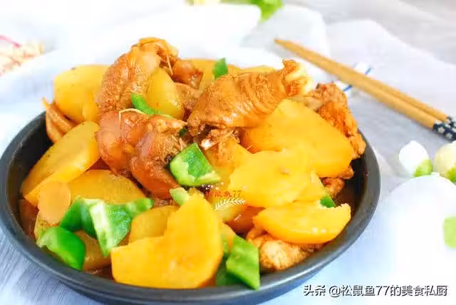 食材:雞塊800克,中等大小的土豆3個,青椒半個,鹽2勺,料酒1勺,蔥半根,姜1塊,大料2個,香葉2片,冰糖適量,生抽2勺,老抽1勺,蚝油1勺,雞精1小勺