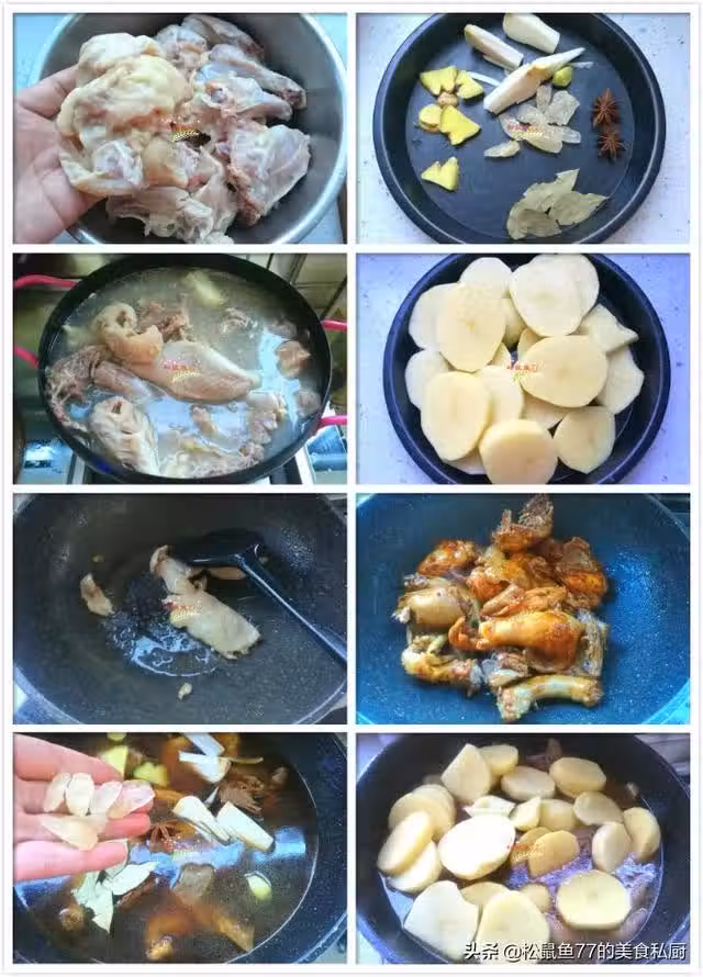 先燒一鍋水,水開後,倒入料酒,放入幾個蔥段和薑片,把雞塊放進去焯燙3分鐘。燒開後會看到浮起許多血沫,把表面的血沫撇出去,剩下的雞塊在鍋里水滾開的地方,用筷子一塊兒一塊兒地夾出來,控干水分。3個土豆去皮切成大厚片。炒鍋燒熱,不用放油,剁雞塊取下來多餘油脂放進鍋里,邊加熱邊用鏟壓,小火慢慢把油脂都逼出來,把雞皮取出不用,喜歡吃留著也可以。把雞塊倒進鍋里,翻炒幾下,加入生抽、老抽、料酒、蚝油繼續翻炒均勻。
