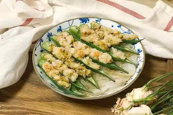 6 將蝦泥裝入秋葵中,再把秋葵放在粉絲的上面,蒸鍋上汽後把盤子,放入蒸鍋,大火蒸8分鐘