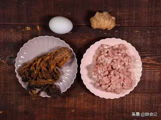 1、梅菜沖洗一遍後,浸泡水中10-15分鐘,去多餘的鹽分,然後把菜葉用手散開,菜葉里有很多細沙。最後把梅菜頭部切除,洗凈擠干水後,切碎備用。
