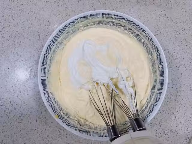 6、 將吉利丁蒸化後,加入蛋糊糊中,一邊攪拌攪拌,一邊往裡面加吉利丁;
