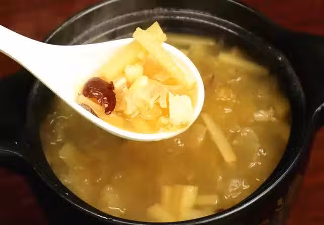 3.把剛剛處理好的原料全部放入鍋中,撒入一把冰糖蓋上鍋蓋,先大火燒至上氣,再轉中火燉煮40分鐘,充分燉出銀耳的膠原。40分鐘以後湯色顯得晶瑩剔透就熬好了,非常簡單。