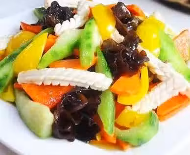 8、鍋內加少許油,大火燒熱,將絲瓜入鍋炒熟,再將其它炒好的食材一起回鍋,灒少許米酒快速翻炒、兜勻,加適量鹽、雞粉調味,用生粉勾個薄芡,裝碟上桌即可