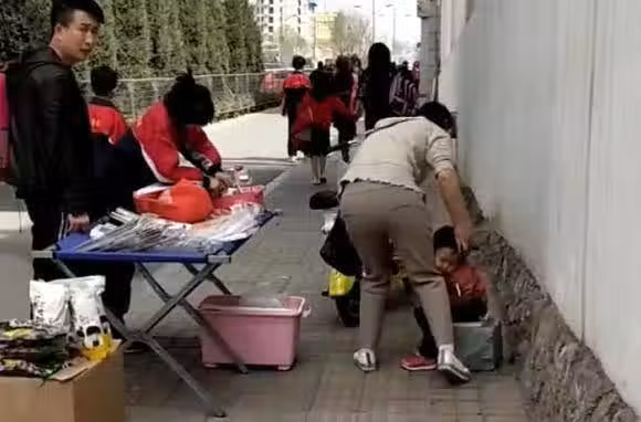 畫面中,我們可以看到這位「艱辛媽媽」正在學校門口的階段進行擺攤做生意,學校門口的人流量比較多,所以說,生意還算不錯。但是因為需要照顧生意,一旁的寶寶就疏忽了很多。「艱辛媽媽」一邊照顧著生意,另外一隻手還哄著坐在一旁的萌娃,因為時間比較長了,萌娃也已經在媽媽的腿上打起了瞌睡,那樣子也是實在是讓人心疼。