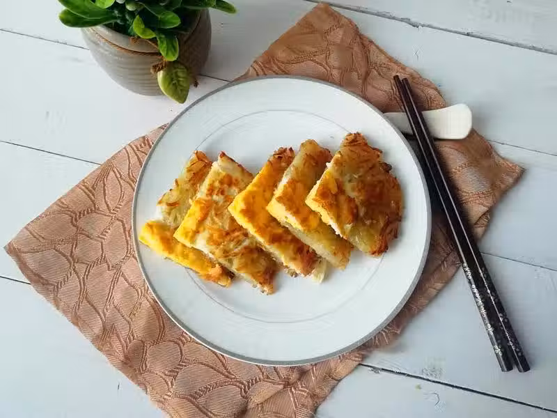 5.將兩面煎制金黃,盛出控油,裝盤即可,在切成小份也可以