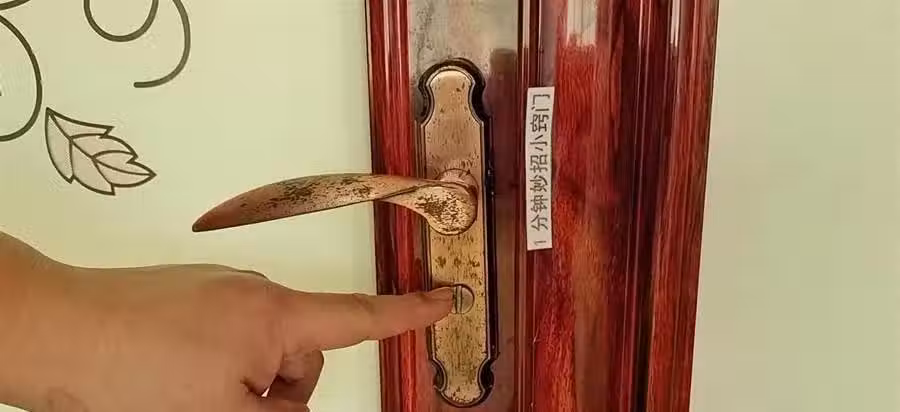 其實家裡衛生間的門設計的是非常人性化的,為了防止家裡的一些老人洗澡暈倒,或者家人突發的事故,就在門把手的下方,設計了一下圓形的小開關,而這個實心的小按鈕,就是連接門裡面反鎖的一個小開關。