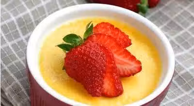 10、將混合物倒入模具中九分滿,烤盤中注入2厘米高的熱水,放入模具,一起放入175度預熱的烤箱中,烤約35分鐘,取出放上切片的草莓即可