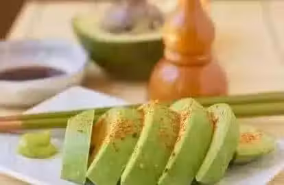 2、裝盤後淋一些醬油,撒上芝麻裝點,吃的時候配合一些芥末口感更好。牛油果瞬間變身三文魚的口感!