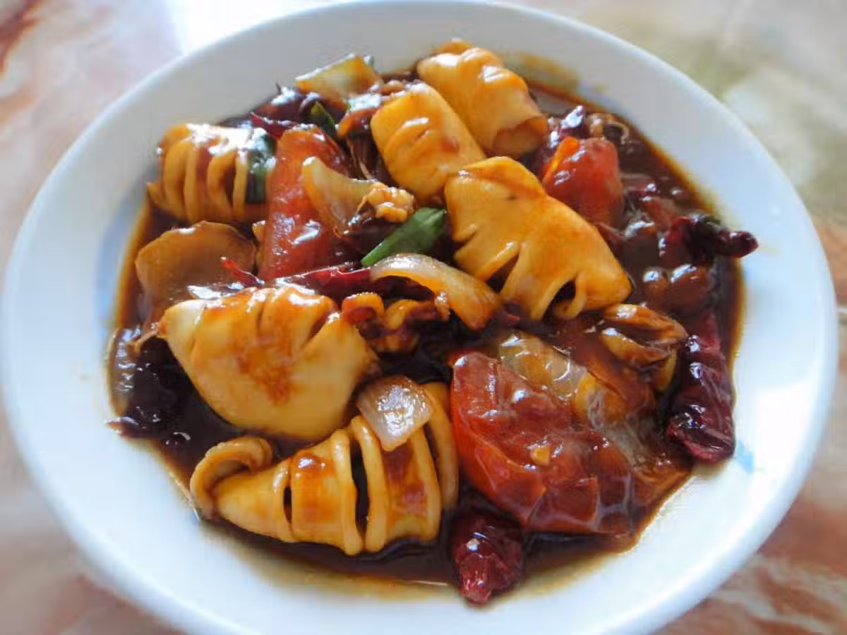 6、 倒入蘇東、大蔥和調味料翻炒至熟,收汁即可。