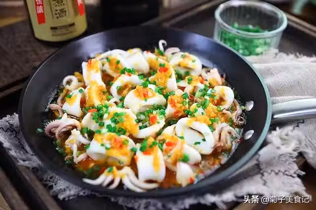 第三步:鍋里下適量油燒熱,放入切好的蒜蓉和紅辣椒煸出香味再放入白糖,把魷魚下鍋排好焗3分鐘,放入海南黃椒醬再焗2分鐘,起鍋前撒入蔥花就可以開吃啦,超級美味