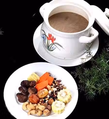 這種五行養生湯選取紅豆、黃豆、白芸豆、黑豆、豌豆,再配上胡蘿蔔、玉米、蜜棗、無花果、冬菇、腰果等,一起慢火熬煮。此湯對於改善睡眠、消除便秘的效果非常好。這五種豆子一起煲湯,能起到很好的養生效果,長期食用,對身心的改善會很有幫助。