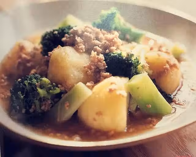 土豆塊從微波爐取出後放入鍋中,中火煮5分鐘左右。煮的時候把準備好的西蘭花放進耐熱容器,在微波爐里加熱2分鐘,然後放進鍋里。把水澱粉加入3湯匙(涼開)水溶解,慢慢倒進鍋里,勾芡出鍋。