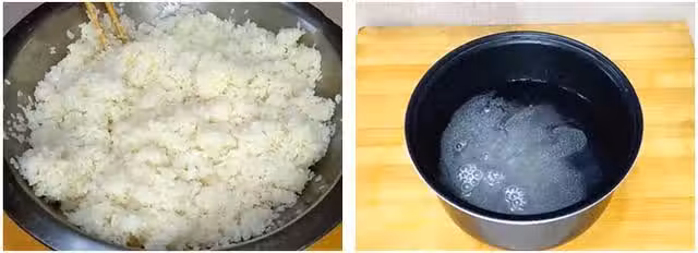 水燒開後蒸30分鐘,把蒸好的糯米拿出來,放入一個乾淨無水無油的大盆里,倒入500克涼白開水,攪拌均勻,讓糯米顆粒分散,等到溫度降低到35℃。