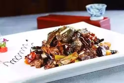 炒鍋炙凈,下入自製甲魚油60克、豬油20克燒至六成熱,下入薑片20克、蒜片20克、青花椒粒5克、干紅椒段10克爆香,加入郫縣豆瓣30克、糖5克炒出香味,倒入拉過油的甲魚塊1000克、青紅美人椒段各200克、炸蒜瓣250克,調入味精3克、雞精3克、白鬍椒5克、老抽5克、高湯200克大火炒勻,待將湯汁收干,沿鍋邊烹入料酒10克、淋入花椒油10克即可起鍋走菜。