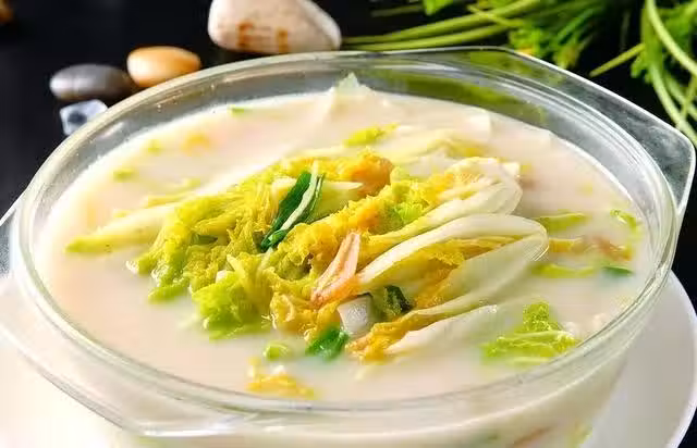2、高湯裡(我用的雞湯)放入娃娃菜煮開。(沒有高湯的也可以用雞精兌水熬制)熟後瀝干裝盤。