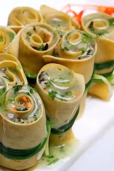 將豆腐皮鋪在案板上切成中塊,將攪好的豆泥,混合成茸,均勻地塗抹在豆腐皮內,包成卷形