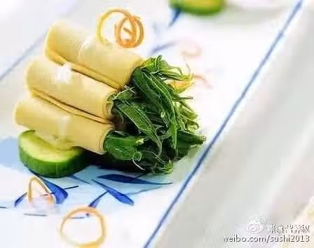 原料:香椿芽50克,五香豆皮100克,鹽1克,紅椒絲,黃瓜片