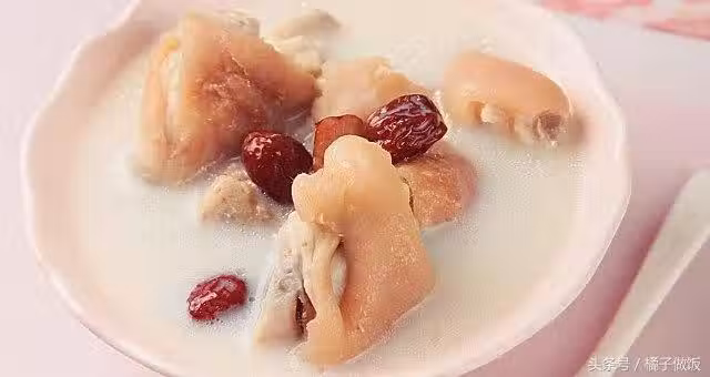 4 砂鍋中注入高湯燒開,放入汆煮好的豬蹄和紅棗,拌勻。
