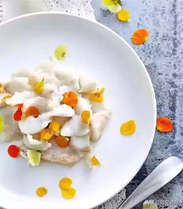 鱸魚1條、鹽1/2茶匙、油200ml、紹興黃酒1湯匙、水澱粉1湯匙、高湯200ml、食用鮮花少許