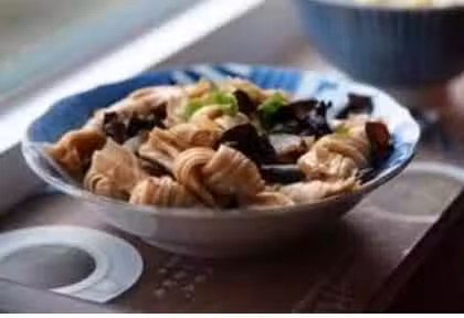 食材:豆腐結、木耳 、鹽、味精 、黑胡椒汁、小蔥 、白芝麻、姜、大蔥。