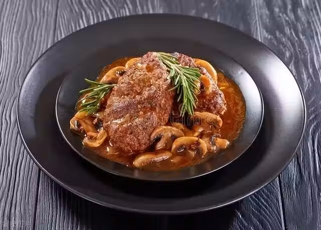 材料:牛排、鹽和黑胡椒、橄欖油、蘑菇、牛奶、麵粉、黃油