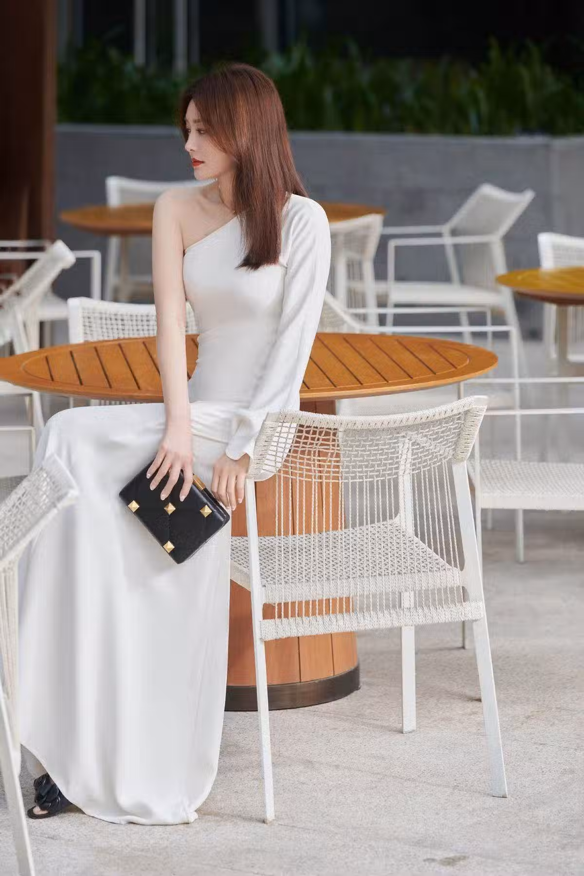 斜肩裙的保守設計更適合呈現溫婉大氣的效果,單品以純色搭配更加耐看,而且在表現力上更注重氣質的呈現,像是秦嵐身上的這條白色長裙,領口以斜肩的方式來襯托鎖骨的線條,上半身修身的效果,更是勾勒身材曲線,最重要的事修身線條不顯僵硬,到裙擺的過渡也非常自然,自然落地的裙擺效果也不會顯得浮誇。