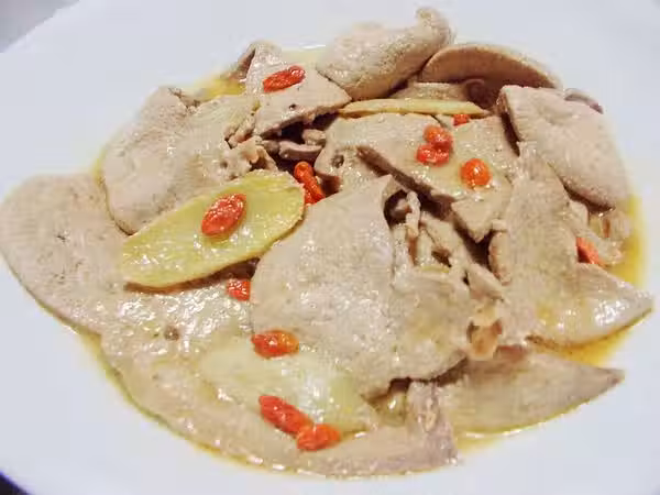 1.豬肝洗凈,切成0.5公分厚度;老薑刷洗乾淨,連皮一起切成薄片; 2.麻油倒入鍋內以大火燒熱,放入薑片,改轉小火爆至薑片兩面均皺起來,且呈褐色,但不能焦黑; 3.轉大火,放入豬肝快炒至變色,加入水,煮開後立即熄火,趁熱享用。 使用階段:產後第一周(自然產)