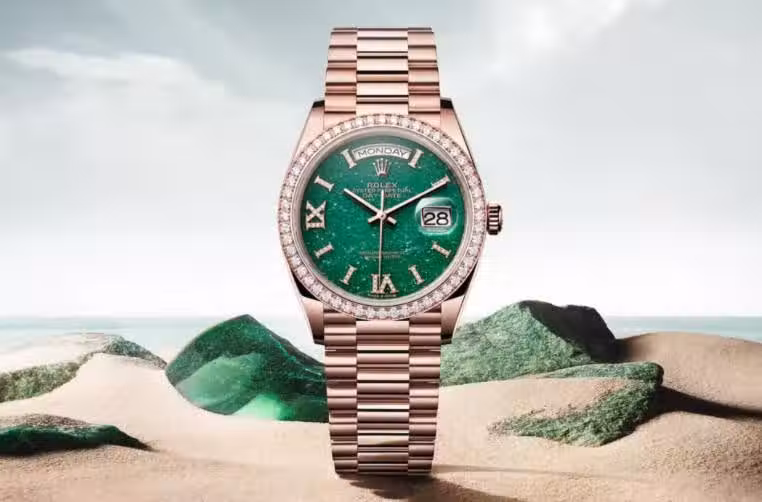 除了彩色琺瑯拼圖面盤,Day-Date 36也加入了三款貴金屬錶殼新作,其中永恆玫瑰金款的面盤以綠色砂金石製作、黃金款的面盤為紅玉髓、白金款的面盤又換上綠松石面盤。