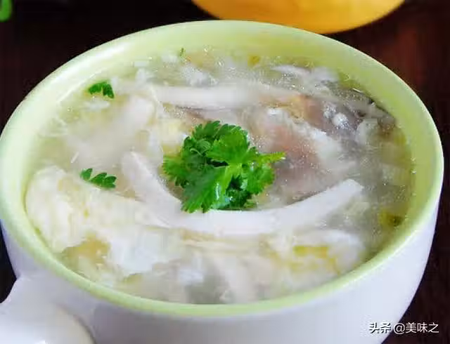 7、水開以後打入蛋花,調入少許雞精和香油,勾薄芡,最後撒上香菜末即可。