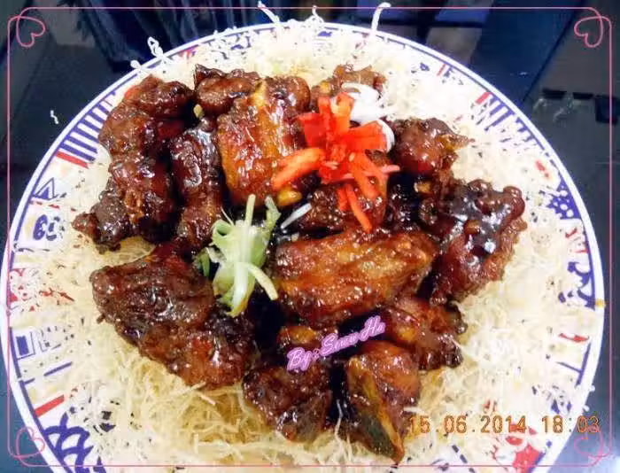 3)燒熱油,將排骨炸至金黃色及熟,撈起瀝幹油