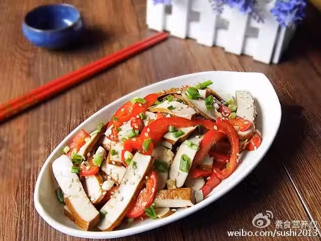 原料:豆乾、甜椒、味精、白糖、生抽、米醋、花椒油、香油