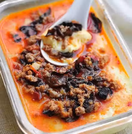 3木耳泡發,去雜質,切碎。姜蒜切成末備用。炒鍋倒油燒熱,下入肉餡和蒜末、薑末炒散。加入豆瓣醬炒香。