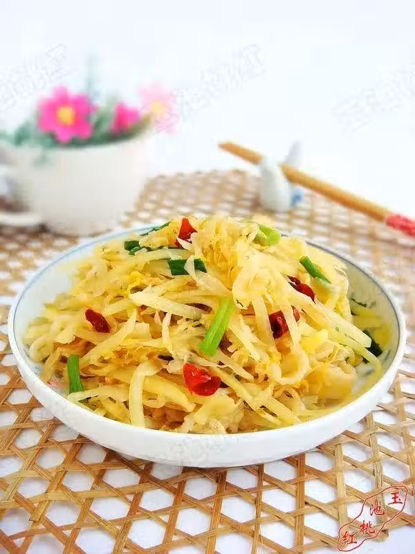 調入鹽、白糖和生抽後繼續炒至土豆絲變軟(約1分半鐘),關火淋入少許香油和小蔥段攪拌均勻即可