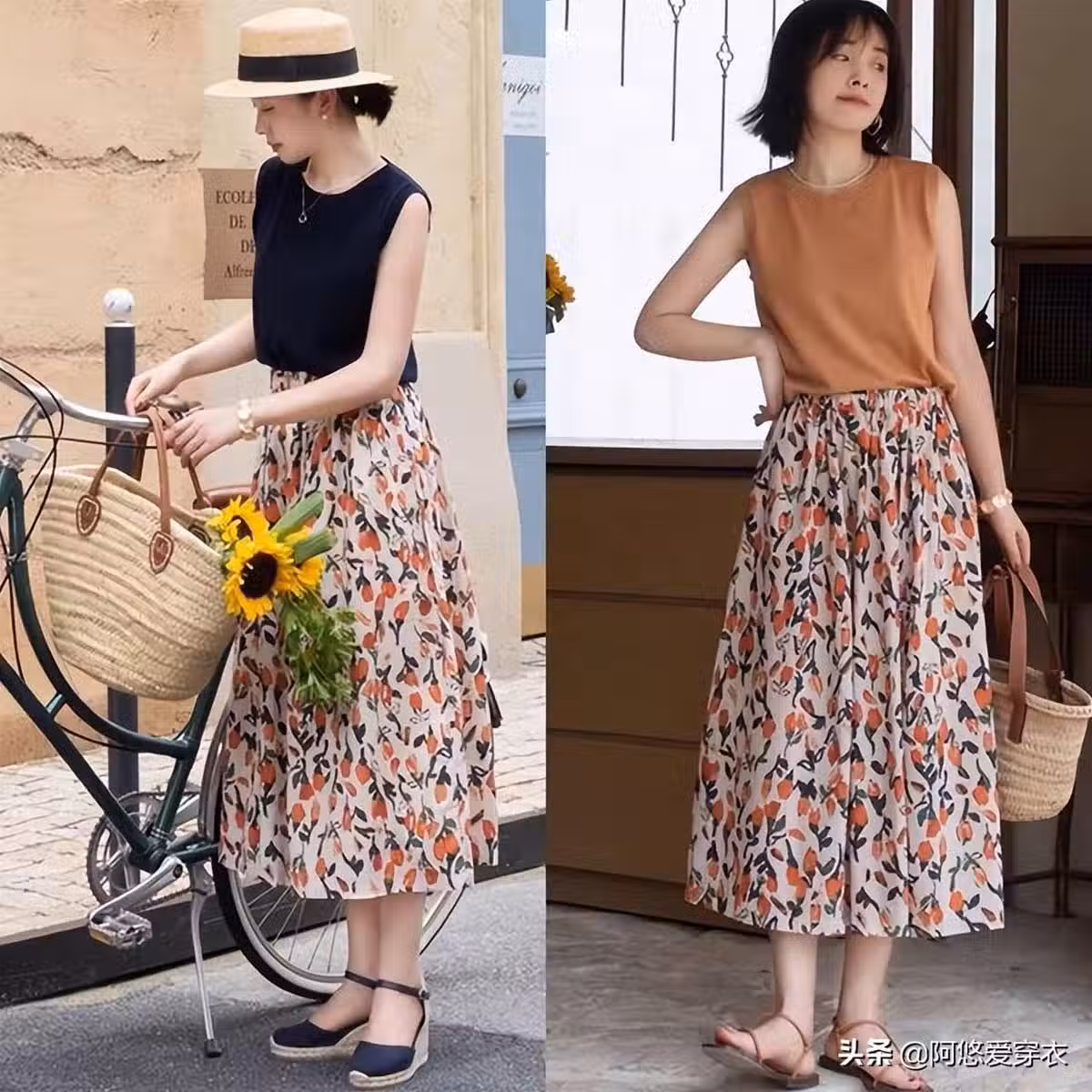 像黑色,白色這些單品往往都是比較實用和百搭的,黑色的T恤在搭配時也有著多種風格可以塑造,下半身去搭配各種彩色印花裙也並不花哨,反而能夠藉助色彩之間的呼應來營造高級感。