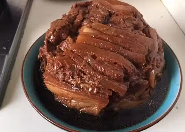 9.蕨菜鋪到肉上面,高壓鍋大火蒸半小時,取出蒸好的肉蓋上盤子,以迅雷不及掩耳的姿勢扣過來,蒸出來的汁用水澱粉加熱勾薄芡淋在肉上,微菜扣肉乾大功告成