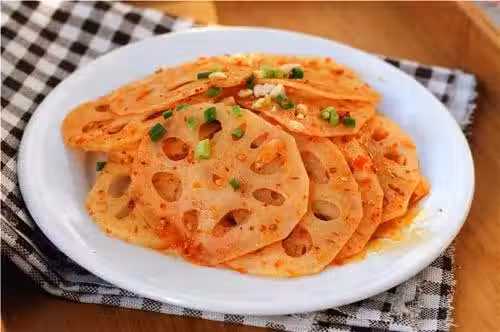 6、將炒好的藕放入涼開水中浸泡一下