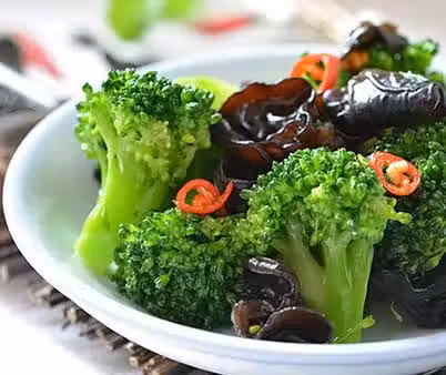 用料:西蘭花1顆、黑木耳5克、玉米油適量、鮮醬油5克、鹽2克、花椒油少許、小紅椒1個