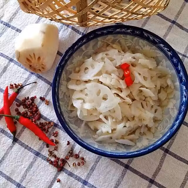 蓮藕2個,紅辣椒1根,花椒、香油、鹽、醋適量