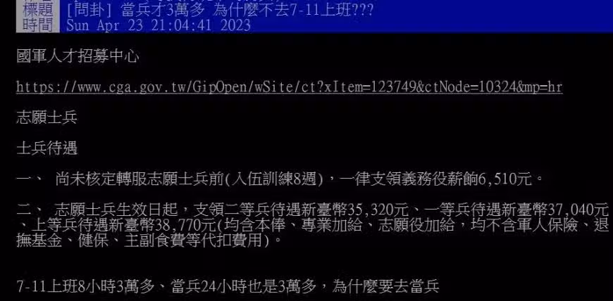 不過,原PO又補充表示,若在7-11上班的話,每天上班時間大約只要8小時,且可以拿到3萬多元的薪水。反觀當兵的話,雖然也同樣可以拿到3萬多,但卻得要工作24小時。對此,原PO就好奇詢問:「為什麼要去當兵?」